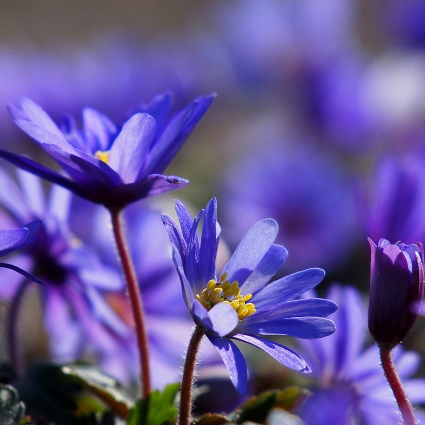 Anemone blanda Blue Shades with its cheerful blue flowers blooms in the early spring.