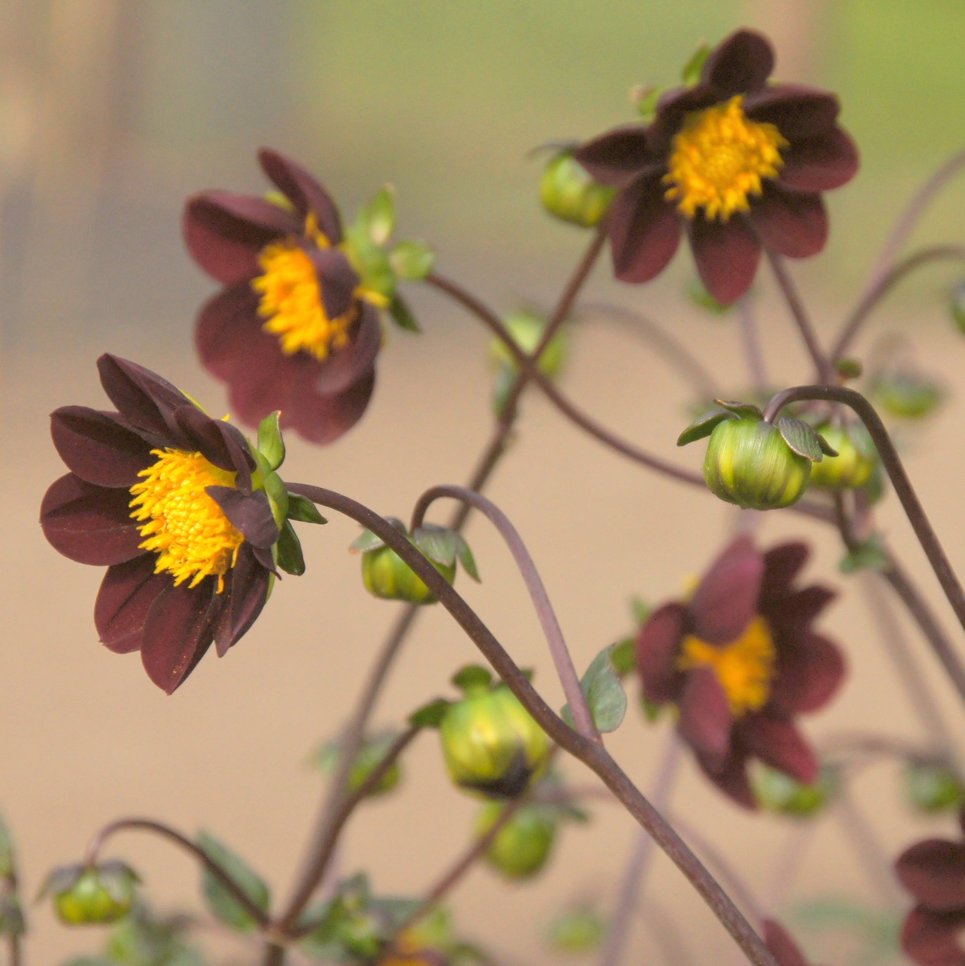 Dahlia Mexican Star, a single flowering dahlia with dark stalks and dark brown/red flowers with a bright yellow heart, and a subtile scent of chocolate. A very bee-friendly due to the open flowers. Can bloom for months, and is also very suitable as a cut flower for the vase, and certainly also suitable for planting in pots for the balcony or terrace.