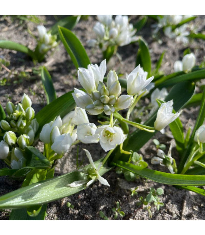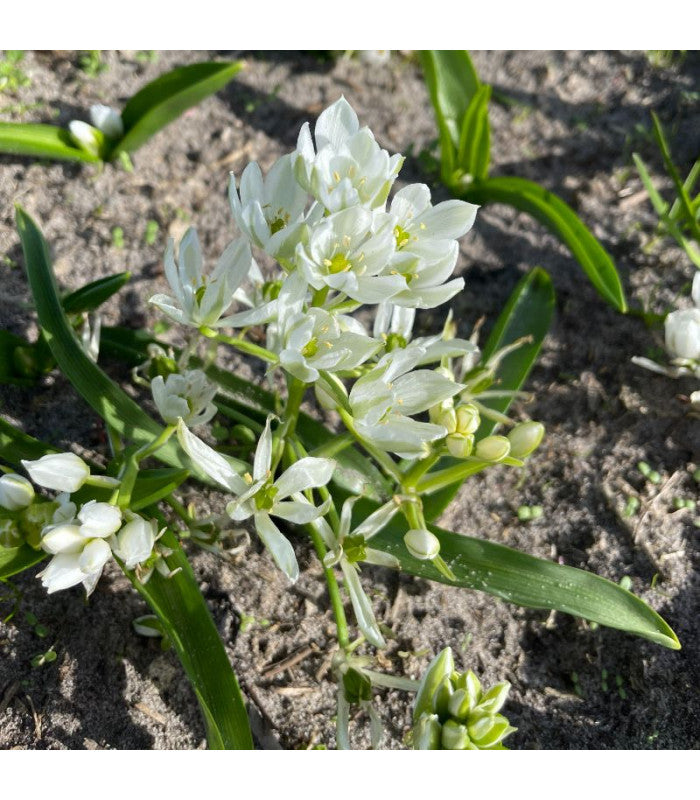 White flowers, star-shaped petals with graceful green stripes on the outside. The 'White Trophy' blooms earlier and is lower than most Ornithogalum species. The short stems can have more than 10 flowers, causing it to bloom for weeks on end.