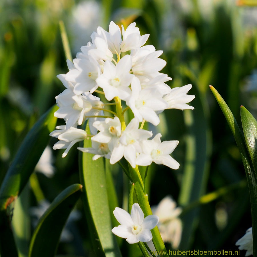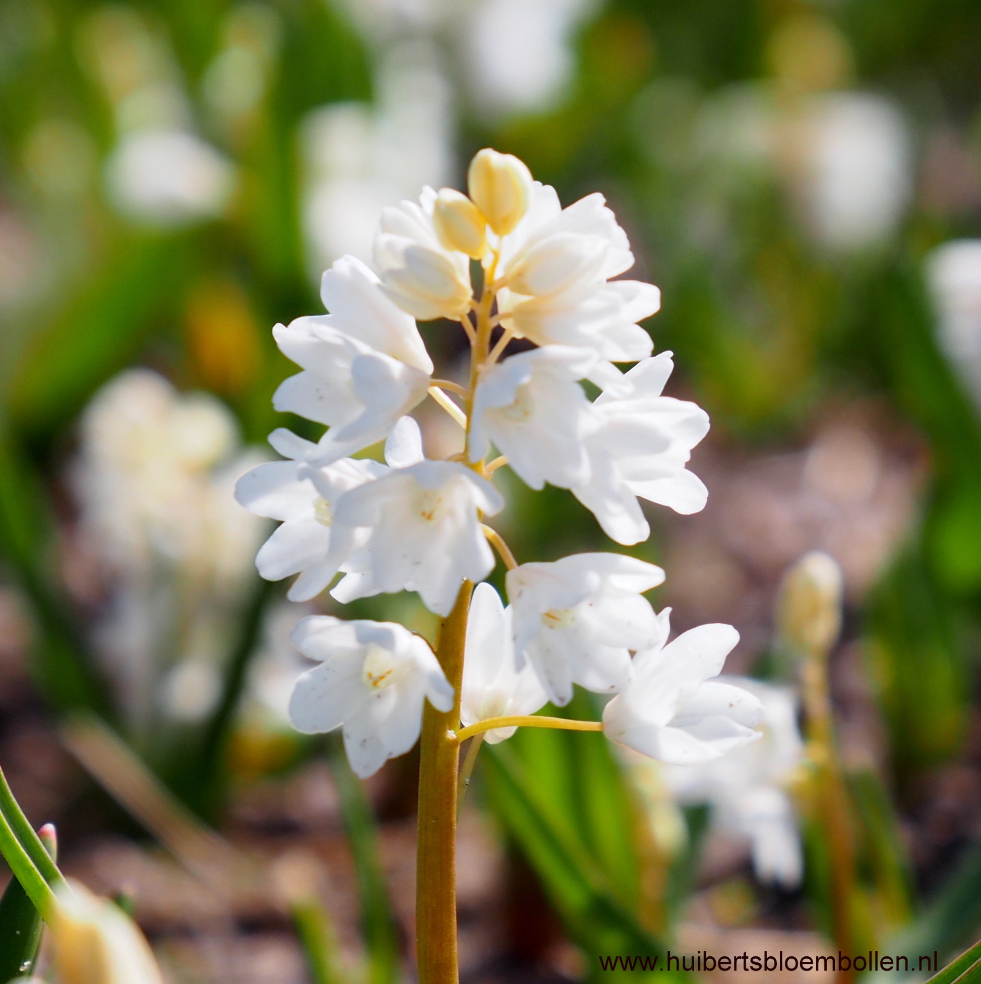 This white variety of Pushkinia Libanotica is a low-growing plant, closely related to Scilla and Chionodoxa, but flowers earlier. Two to three grass-like leaves grow from the bulb. In between a stem with dense clusters of white star-shaped flowers. A fragile looking plant. But appearances can be deceiving, the charming early bloomer also starts to bloom at temperatures below freezing. Still a little too early for the bees, but they know where to find her as soon as the temperature allows.