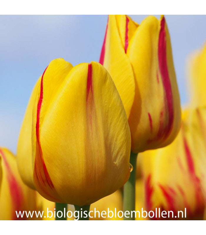 In addition, it is simply a beautiful tulip with a sunny, cheerful appearance. This Triumph tulip with its canary yellow petals with subdued red flamed stripes looks best in a group. Then you will immediately have enough to occasionally pick a bunch for the vase.