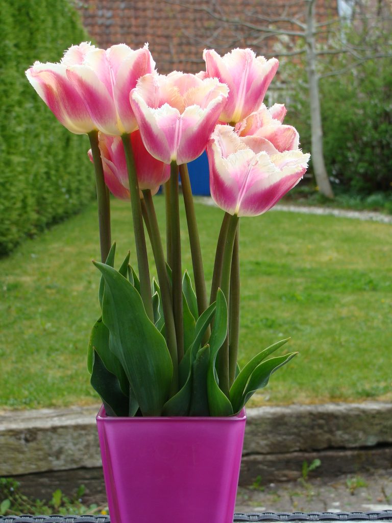 Crispa tulip, with serrated edge. Pink in colour with a white border.
